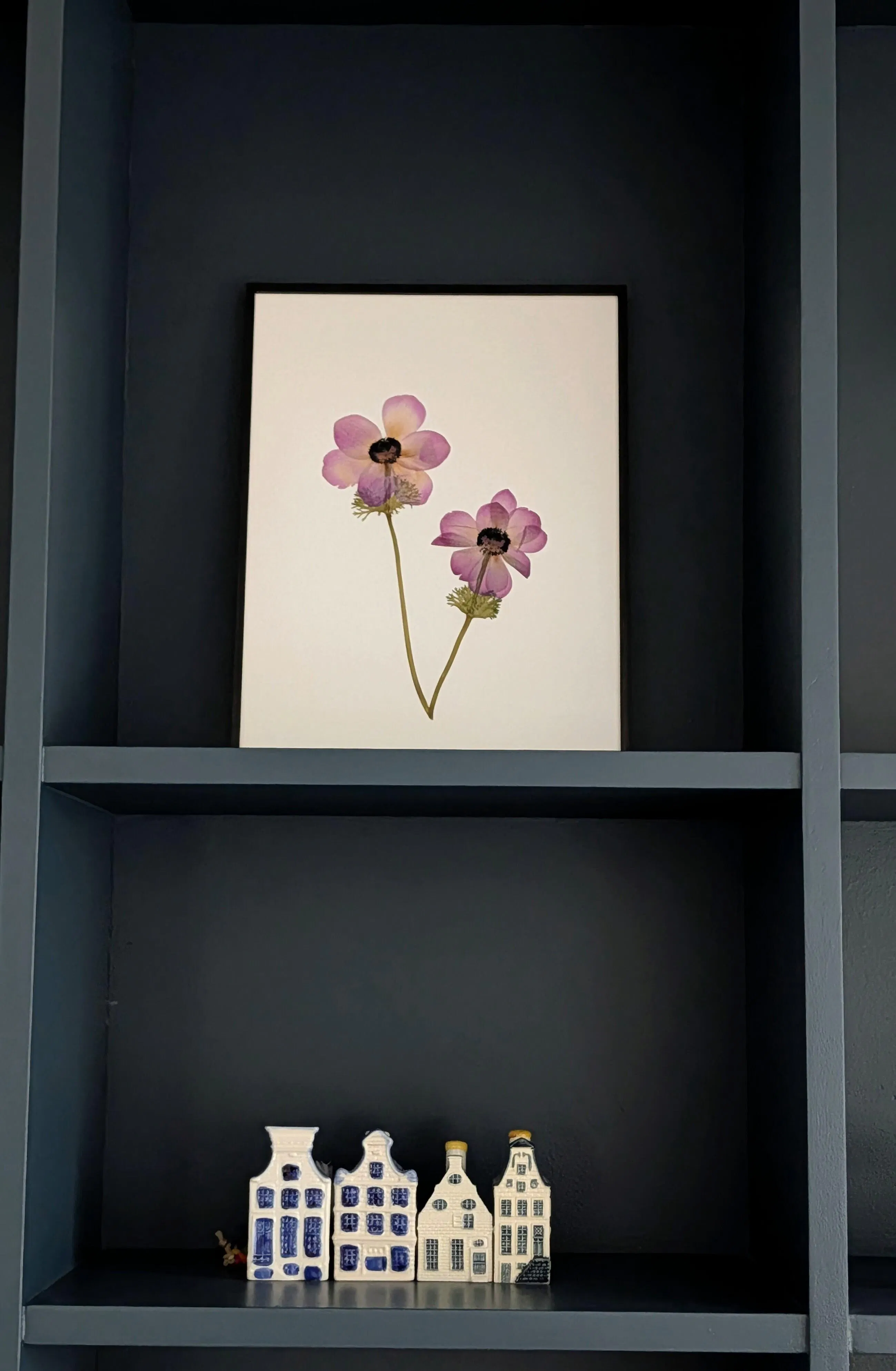 This striking Anemone coronaria, carefully pressed and framed by hand in our studio in the Netherlands, features rich purple petals and a bold dark center. Blooming in early spring, it brings vibrancy and depth to any space.